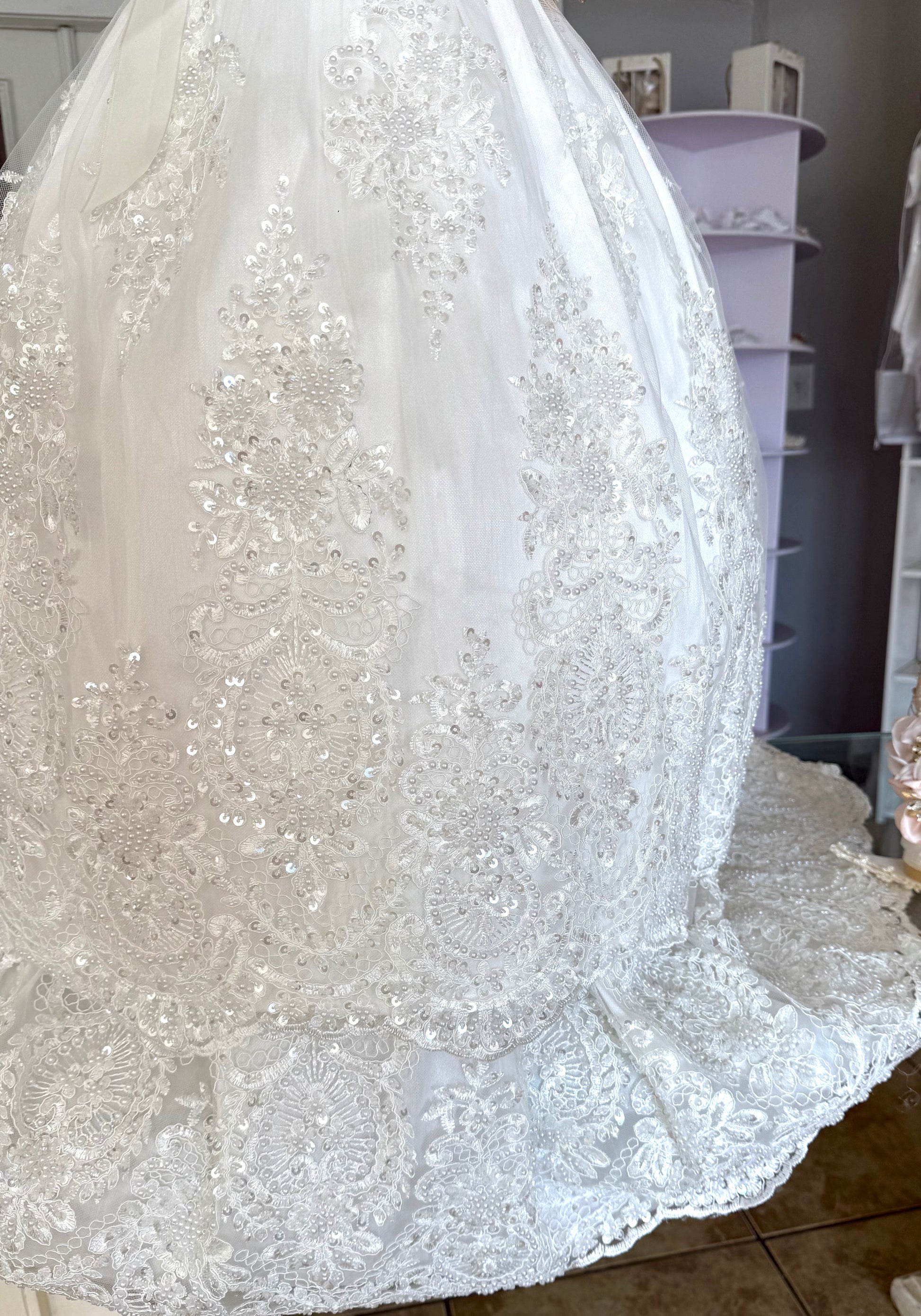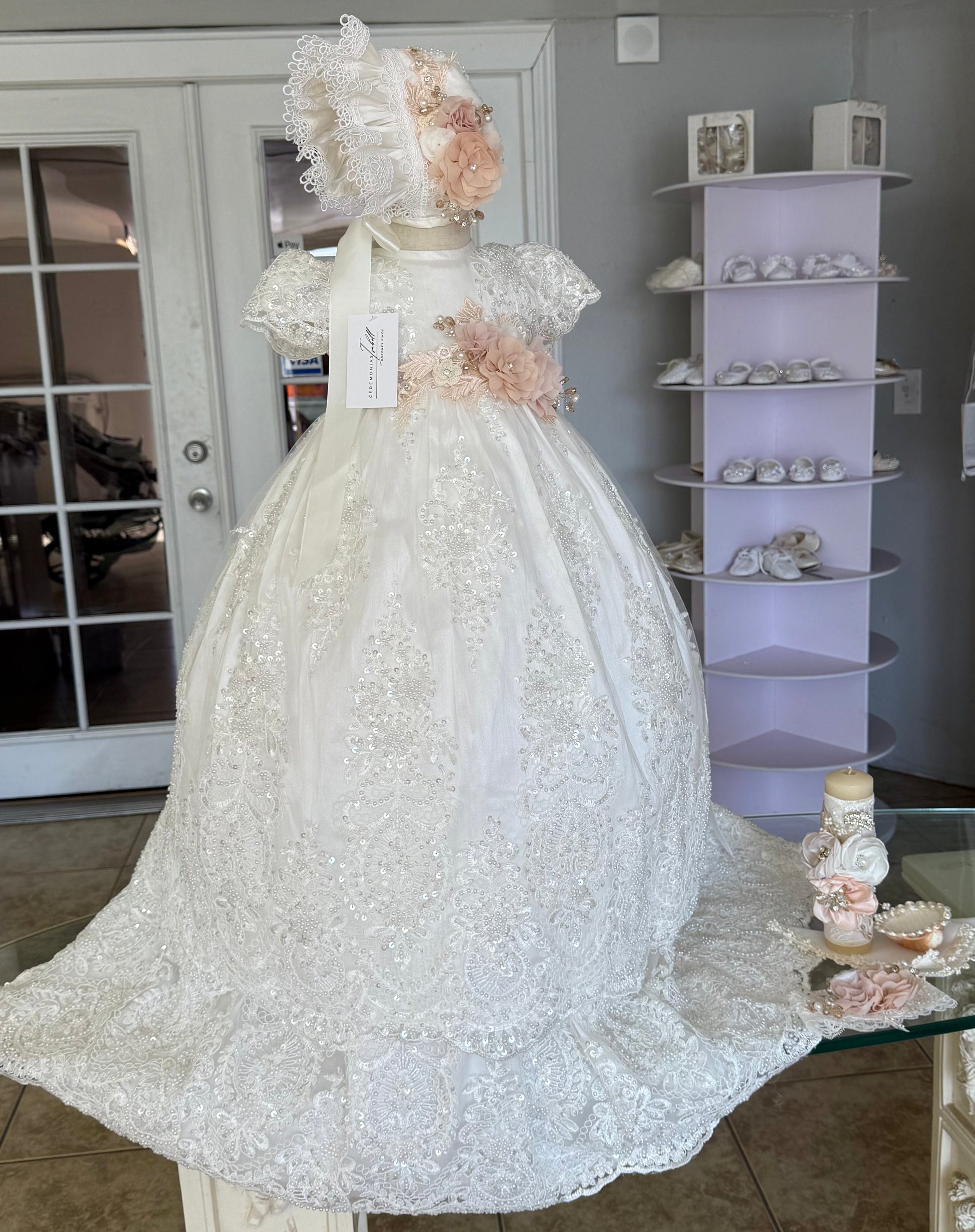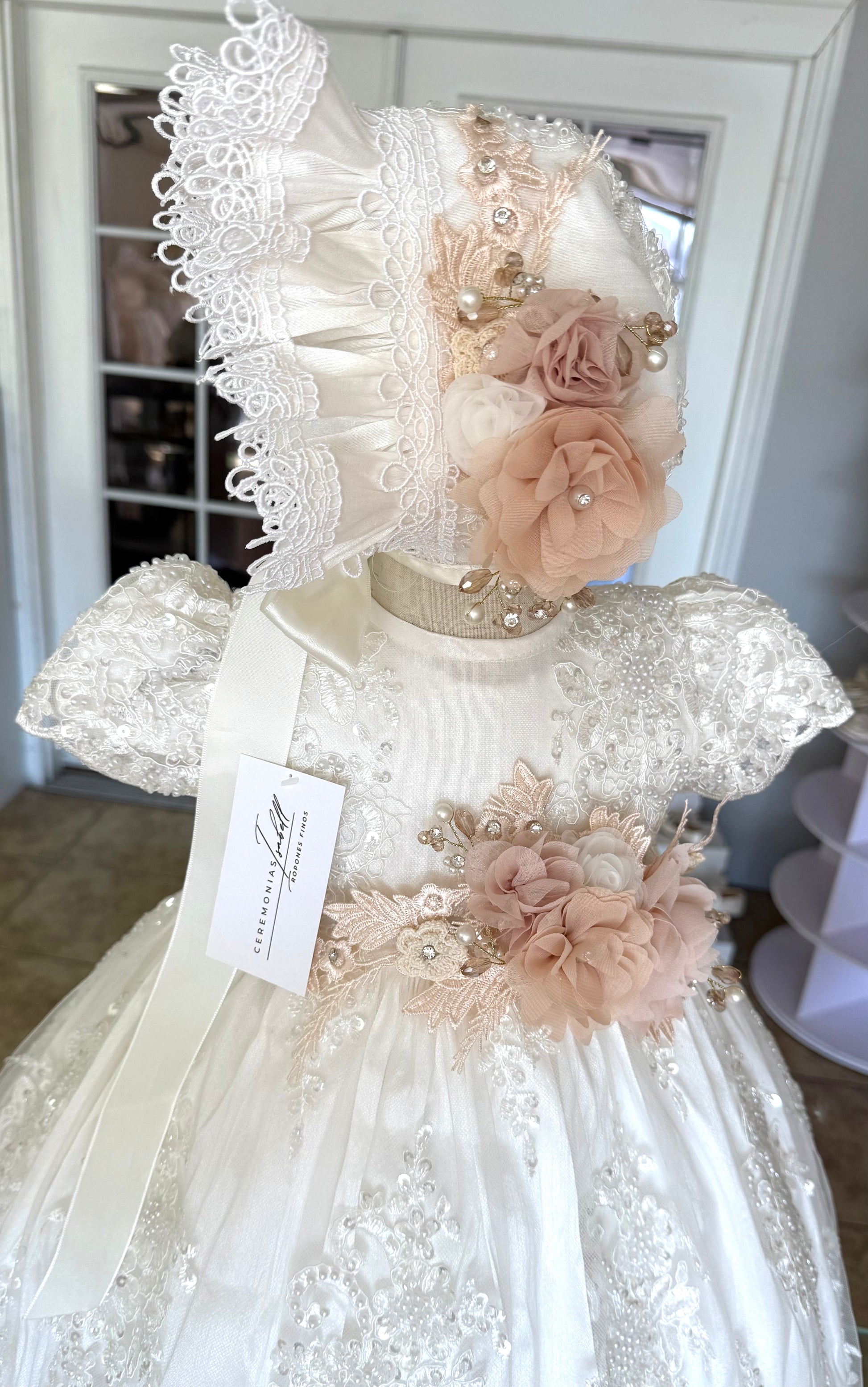 Hermoso ropón de bautizo desmontable color perla ¡EDICÕN LIMITADA! Tiene dos vestidos: uno corto y otro largo. Elaborado artesanalmente en shantung tul francés y tafeta, bordado a mano con flores y perlas finas. Mangas cortas bordadas. Tiene perlas en todo el pecho y falda con encaje y olanes.