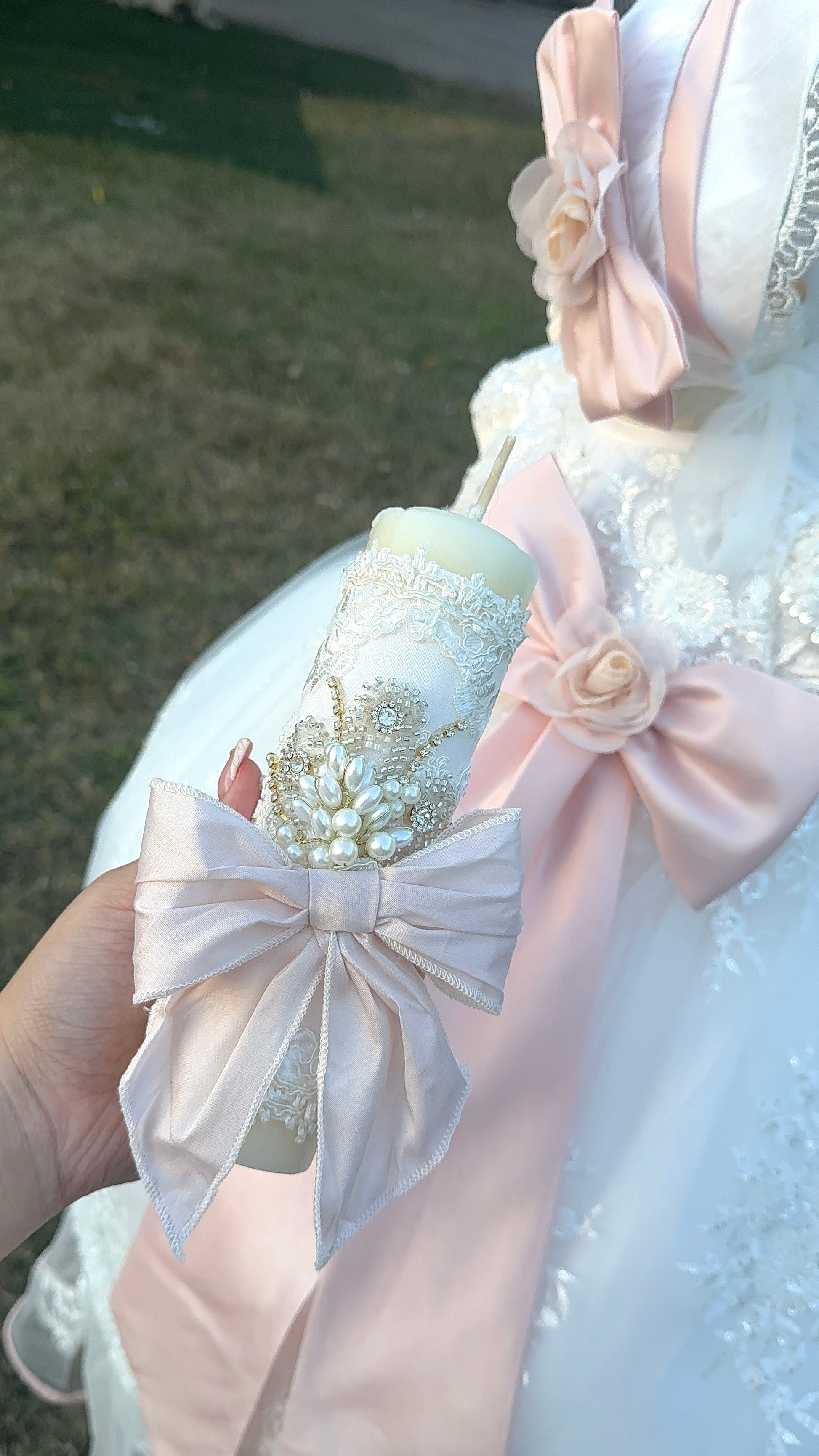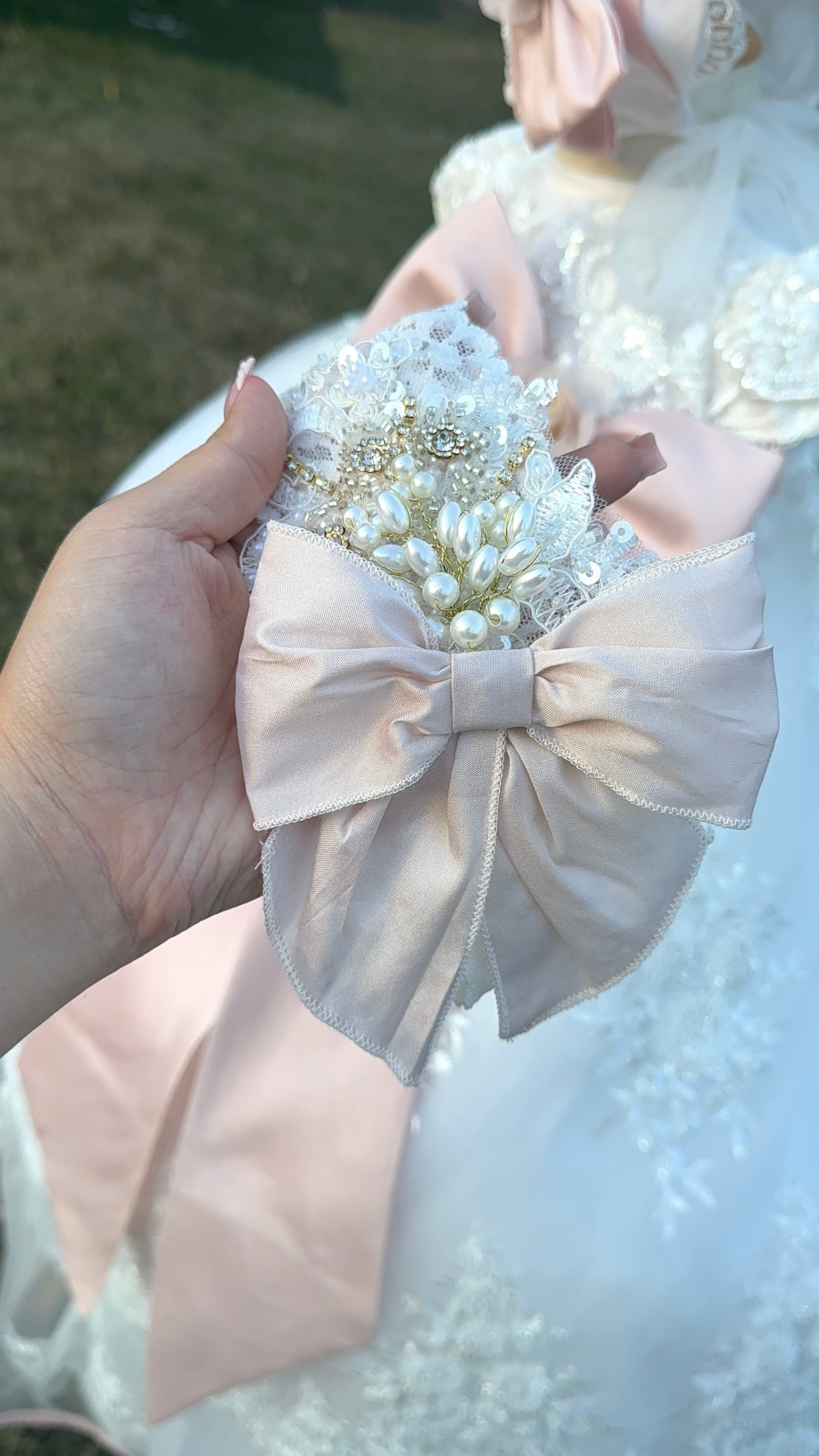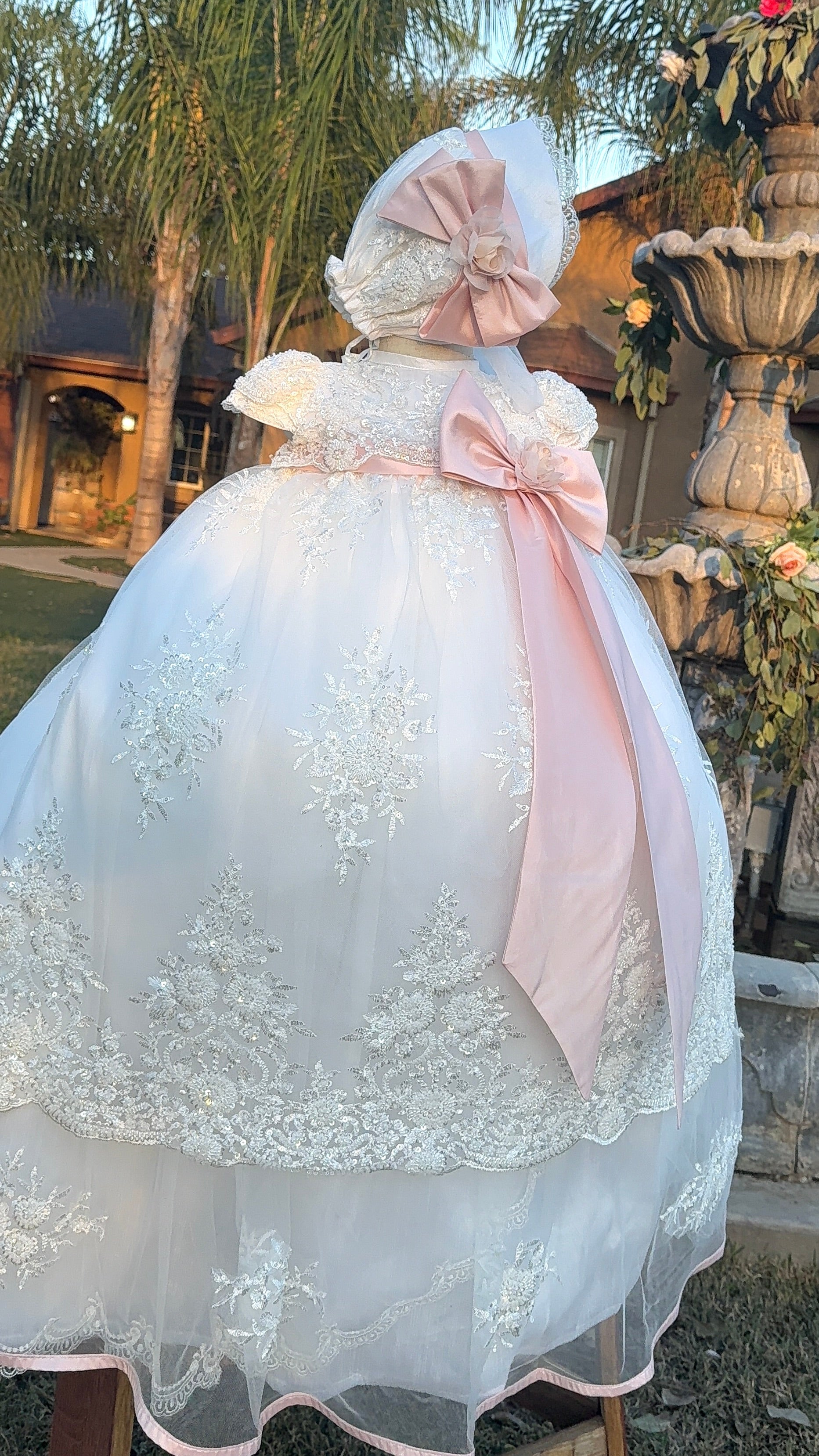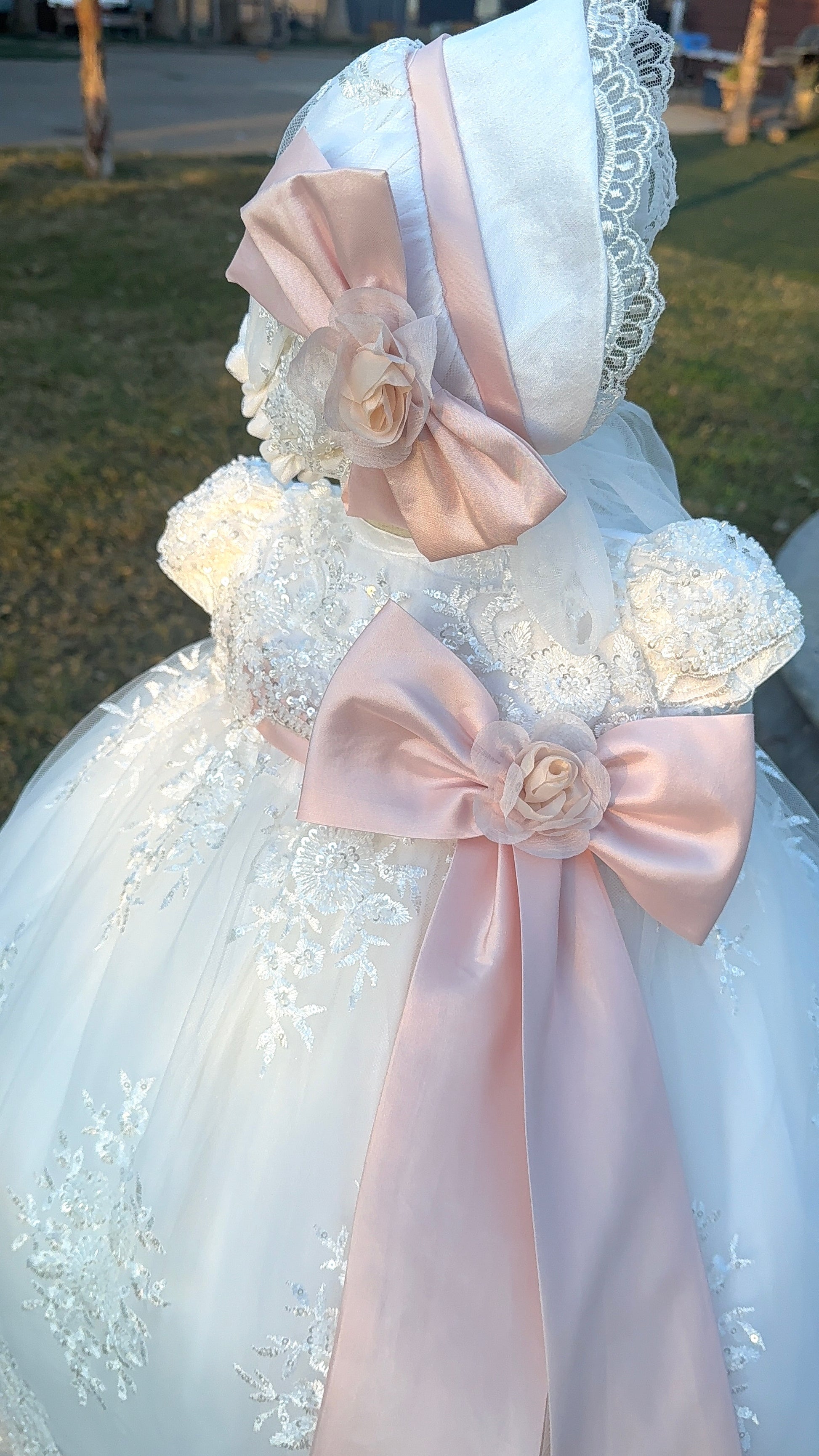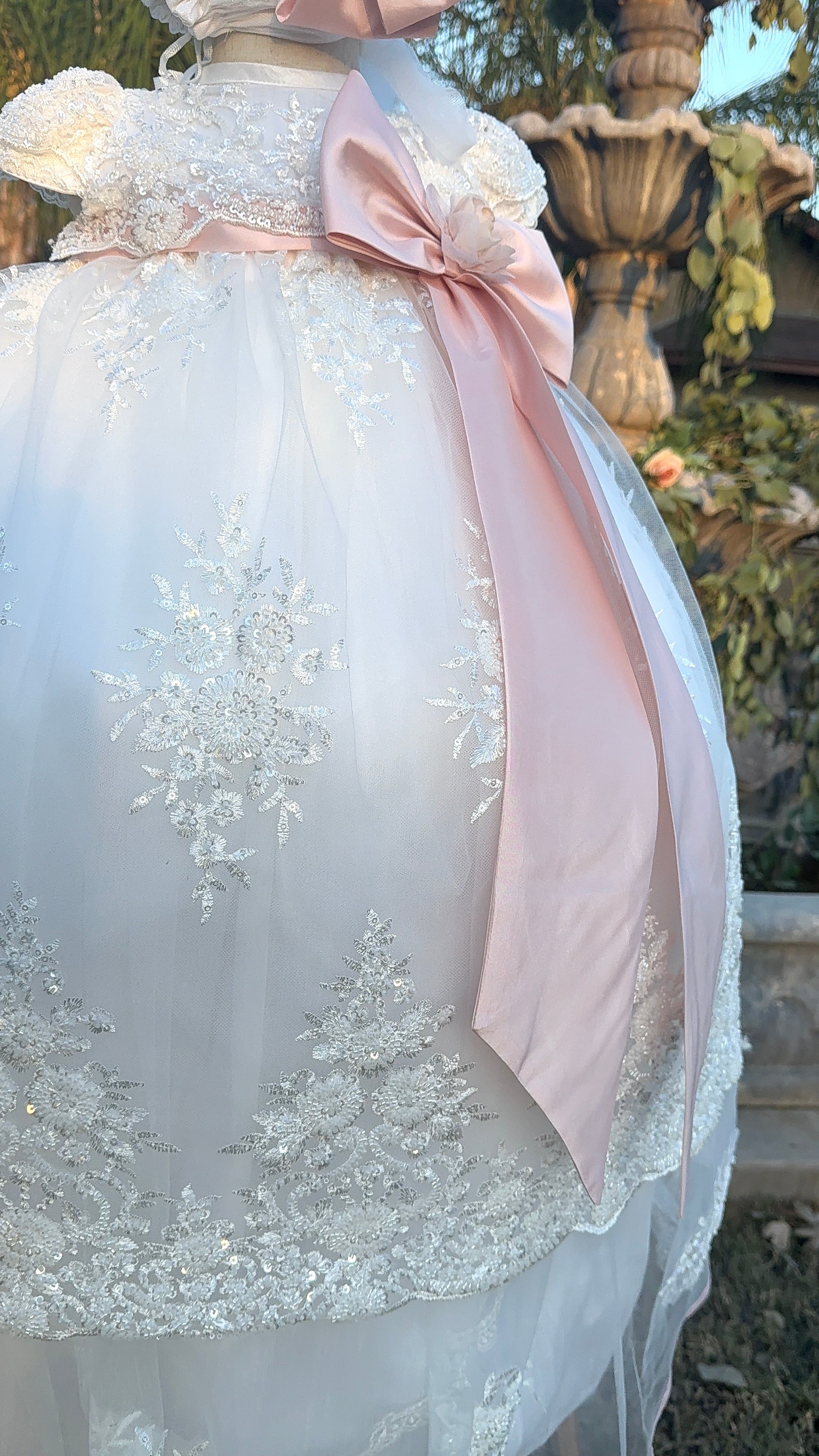 Hermoso ropón de bautizo desmontable color Perla con moño rosita. ¡EDICÕN LIMITADA! Elaborado artesanalmente en shantung, tul francés, y tafeta. Bordado a mano con pedrería finas. Mangas cortas bordadas con pedrería fina y un hermoso moño rosita. Esta bordado en todo el pecho y falda con pedrería fina.