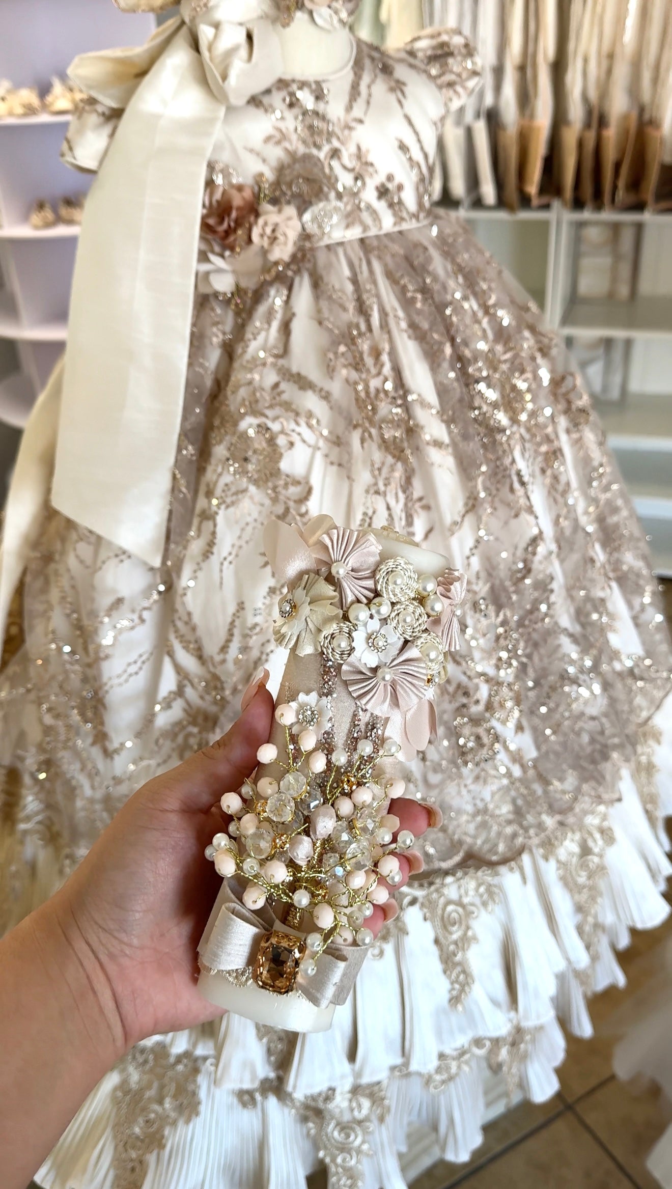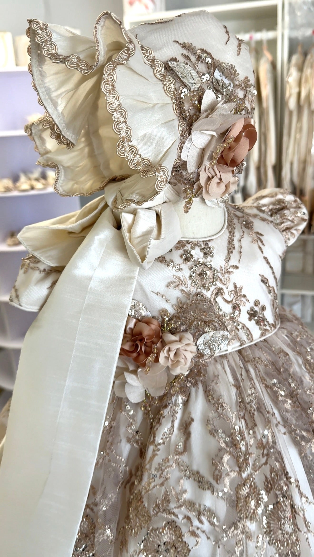 El vestido se ajusta por la parte de atrás con los botones y el listón de la espalda.