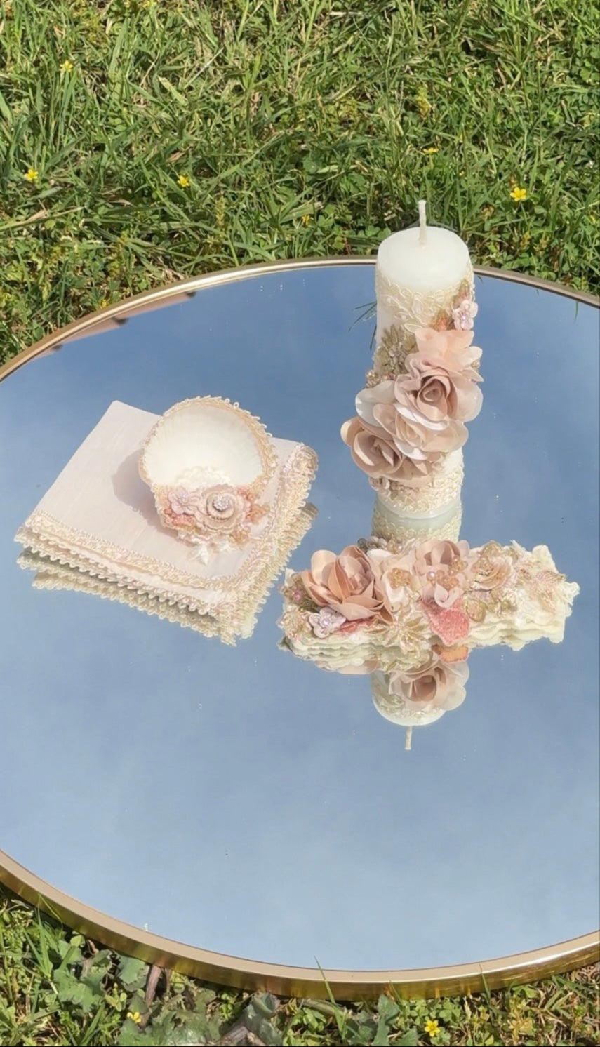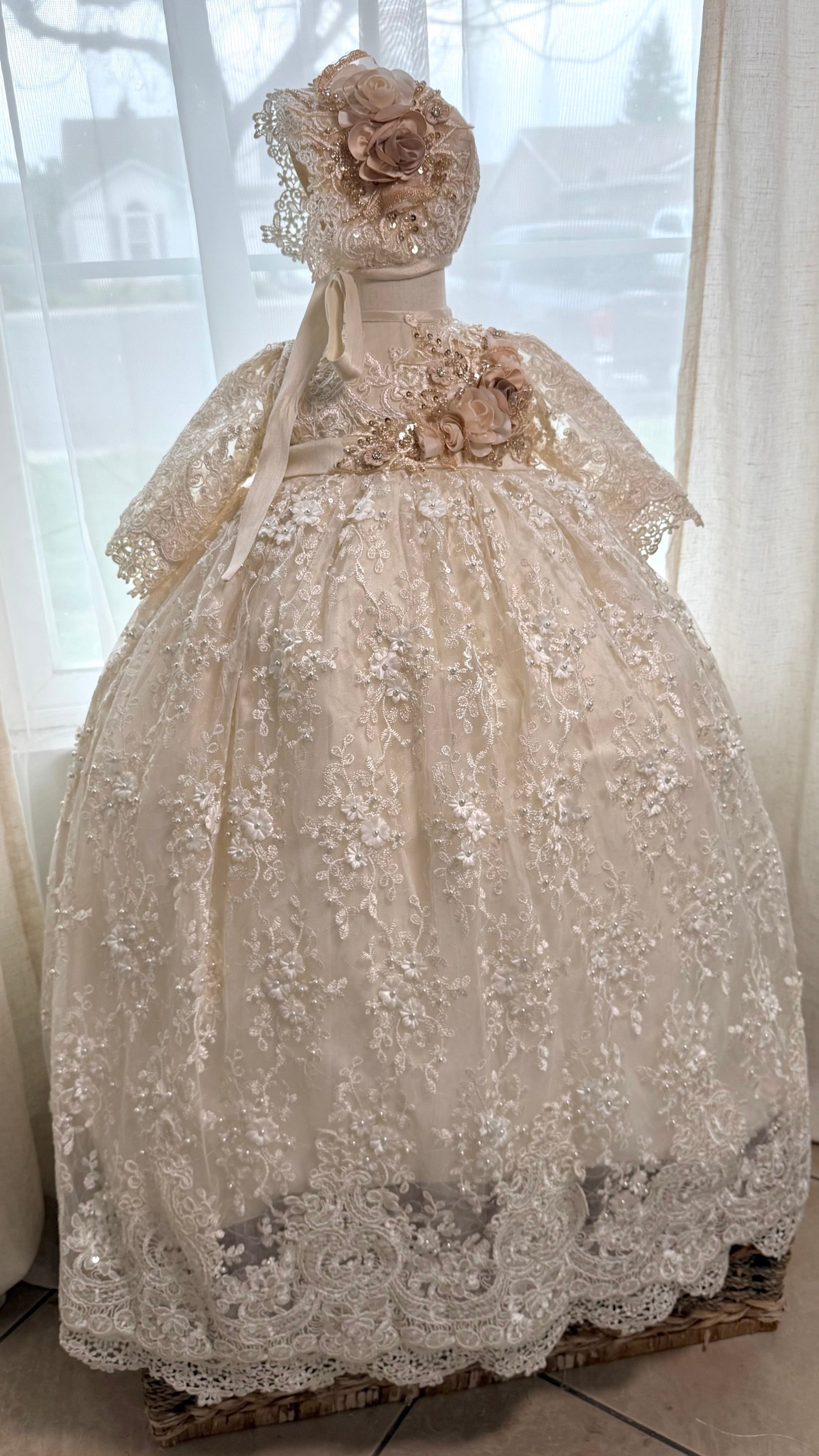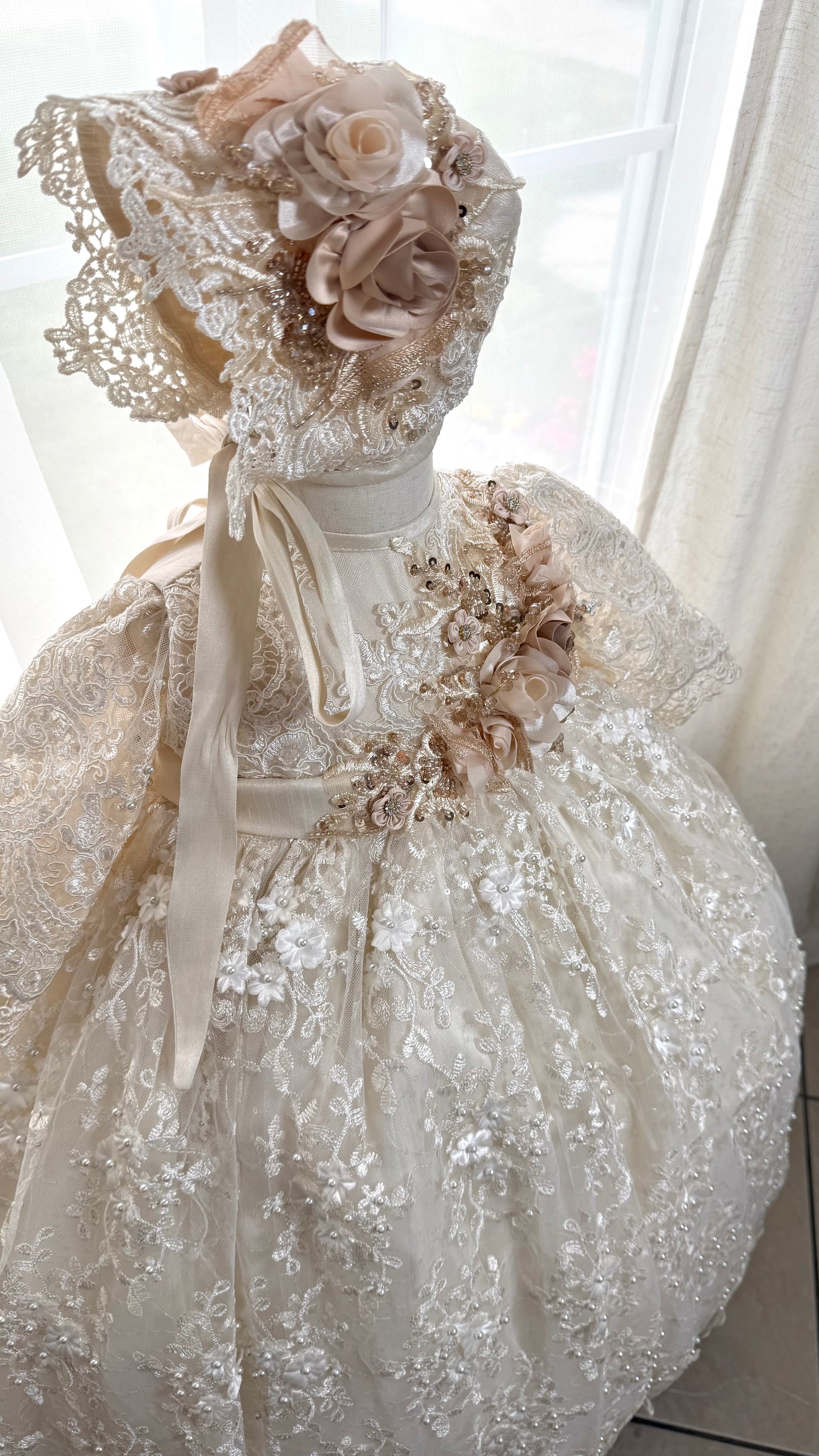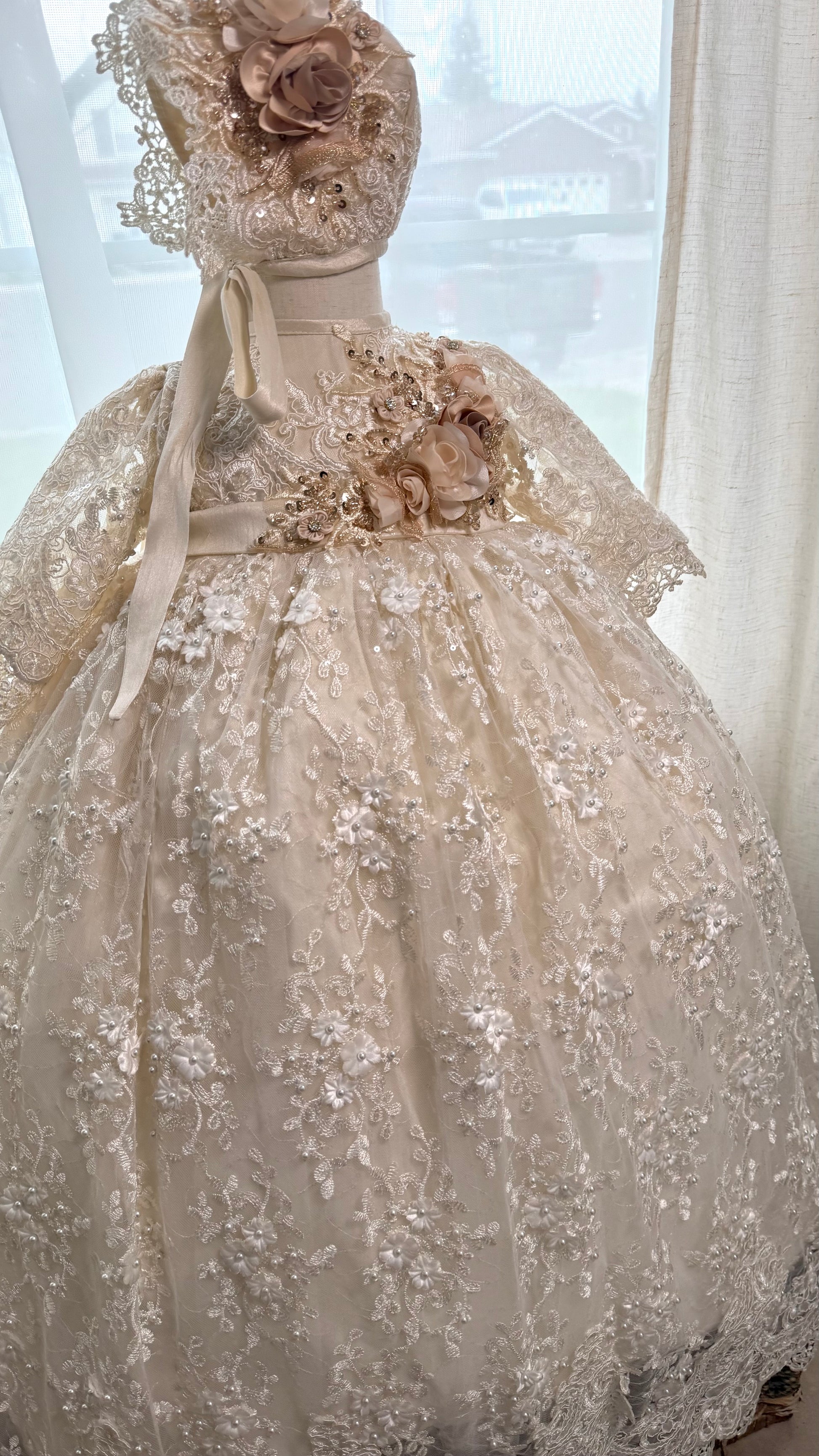 Hermoso ropón de bautizo desmontable color champange. Tiene dos vestidos: uno corto estillo tutu y otro largo. Elaborado artesanalmente en shantug, tul francés y tafeta, bordado con perlas finas. Mangas largas bordadas. Bordado en todo el pecho y falda con encaje y perlas.