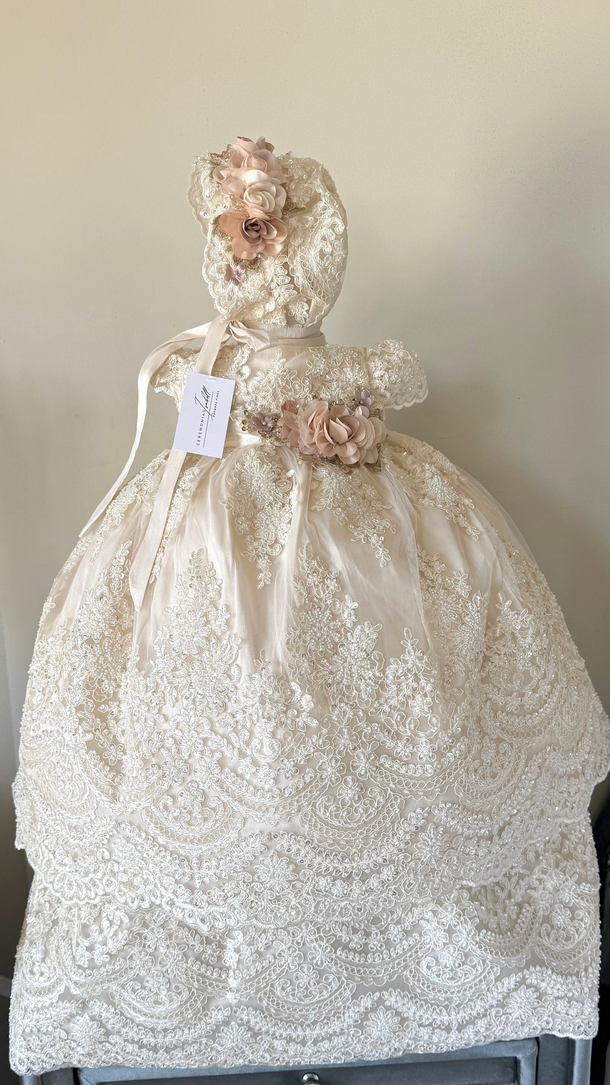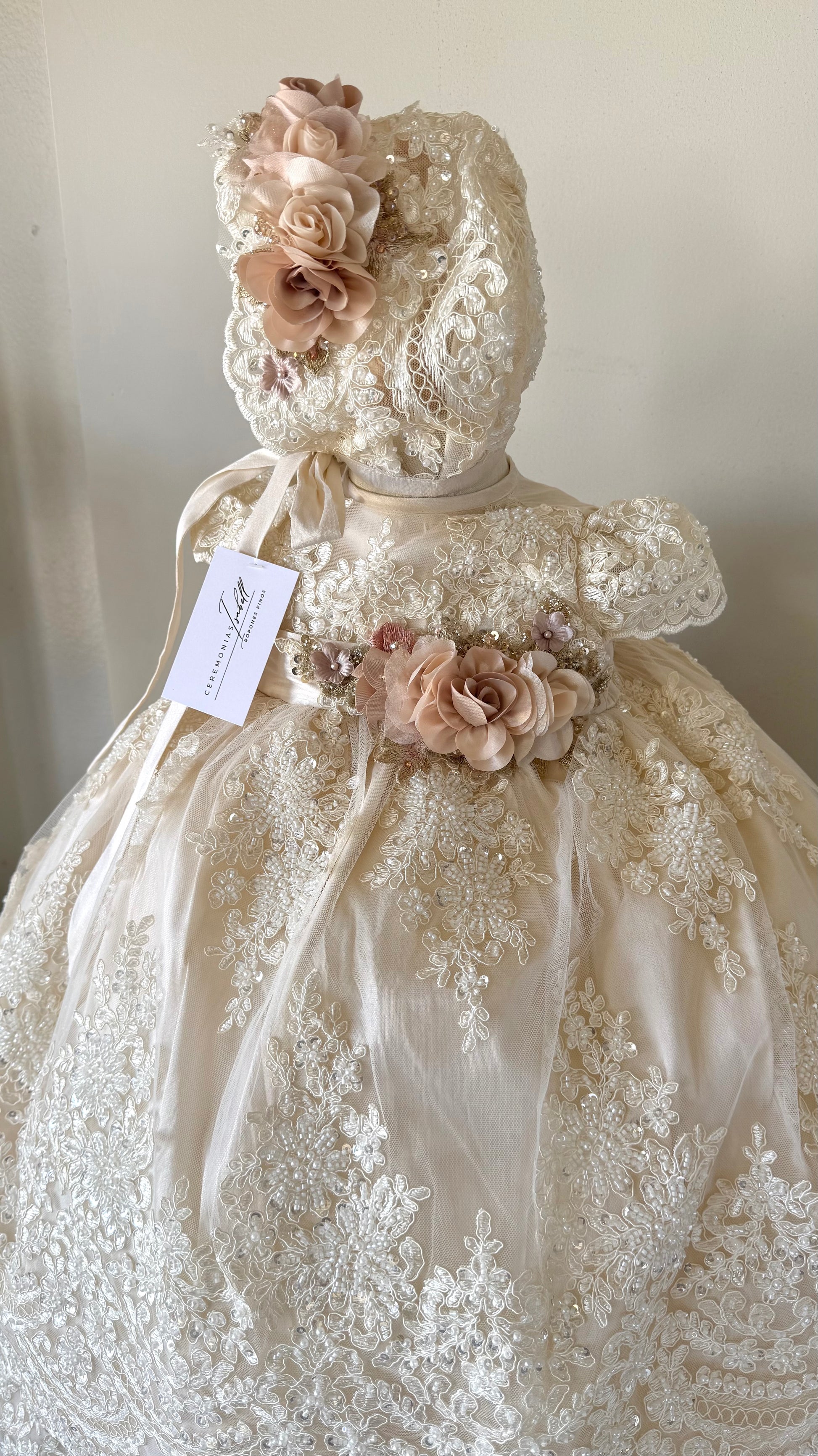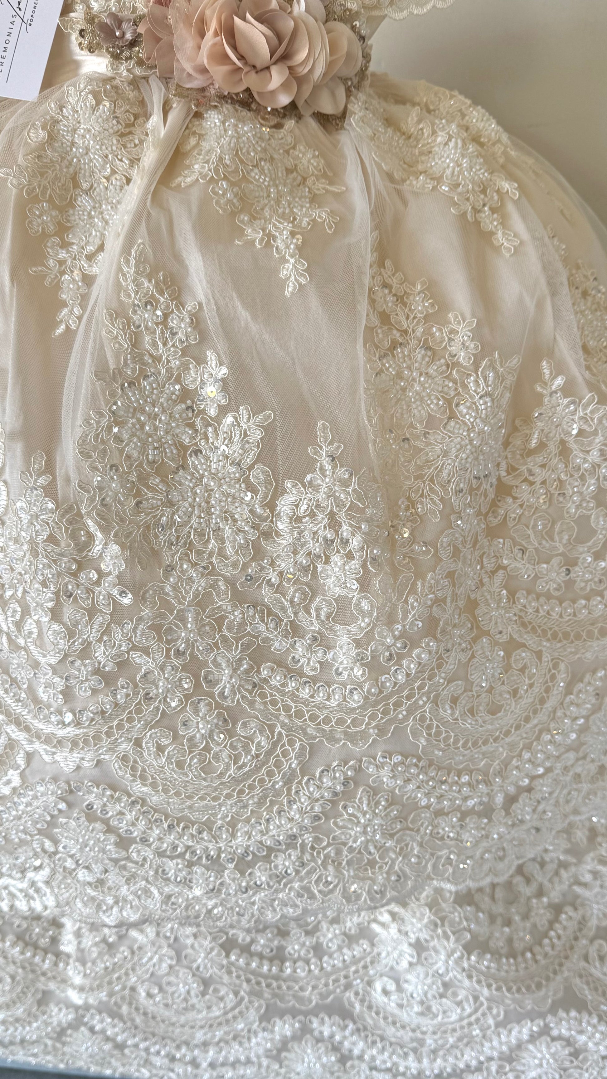 Hermoso ropón de bautizo desmontable color champange. Tiene dos vestidos: uno corto y otro largo. Elaborado artesanalmente en shantug, tul francés y tafeta, bordado a mano. Mangas cortas bordadas. Esta bordado en todo el pecho y falda con encaje.